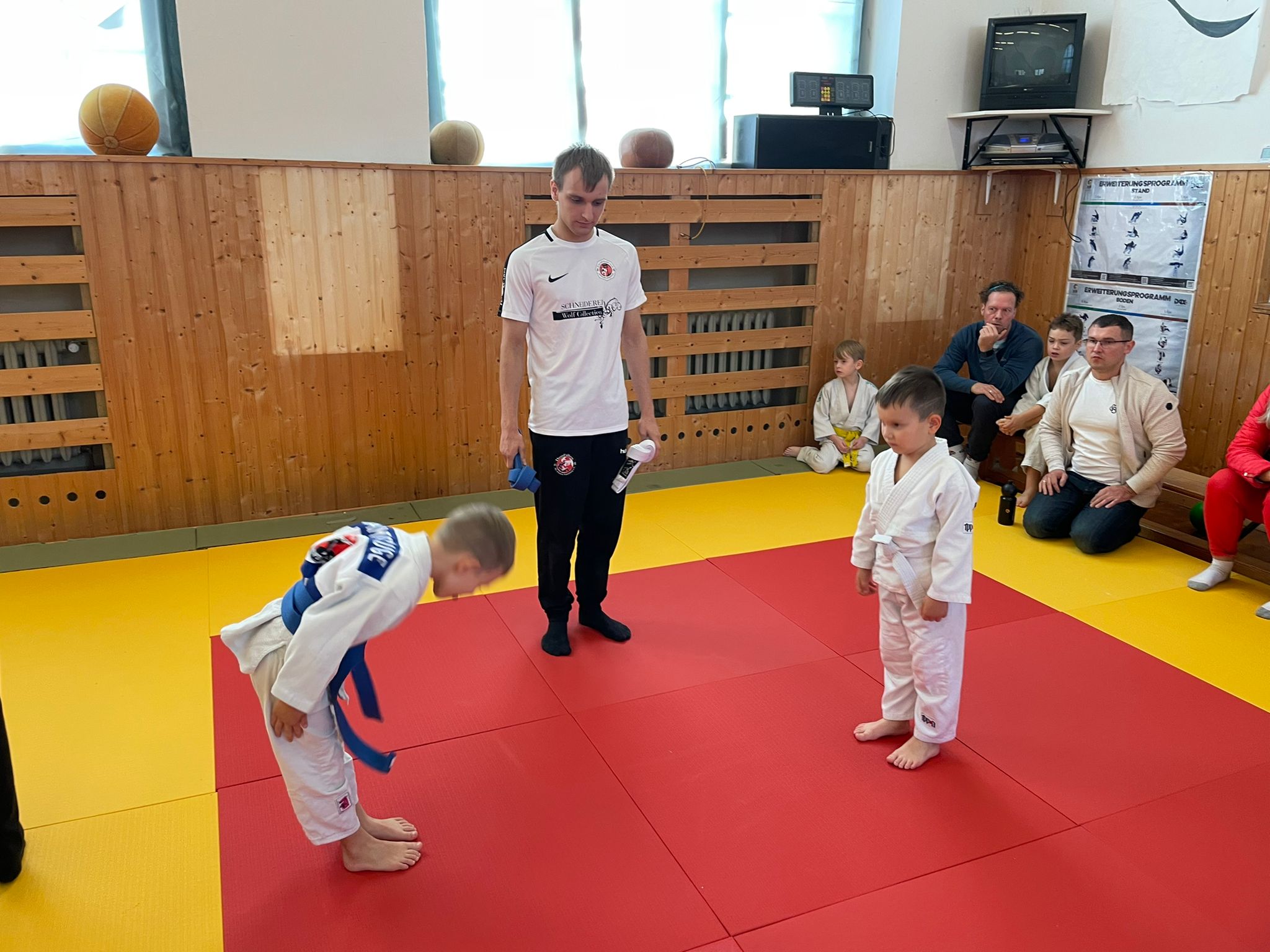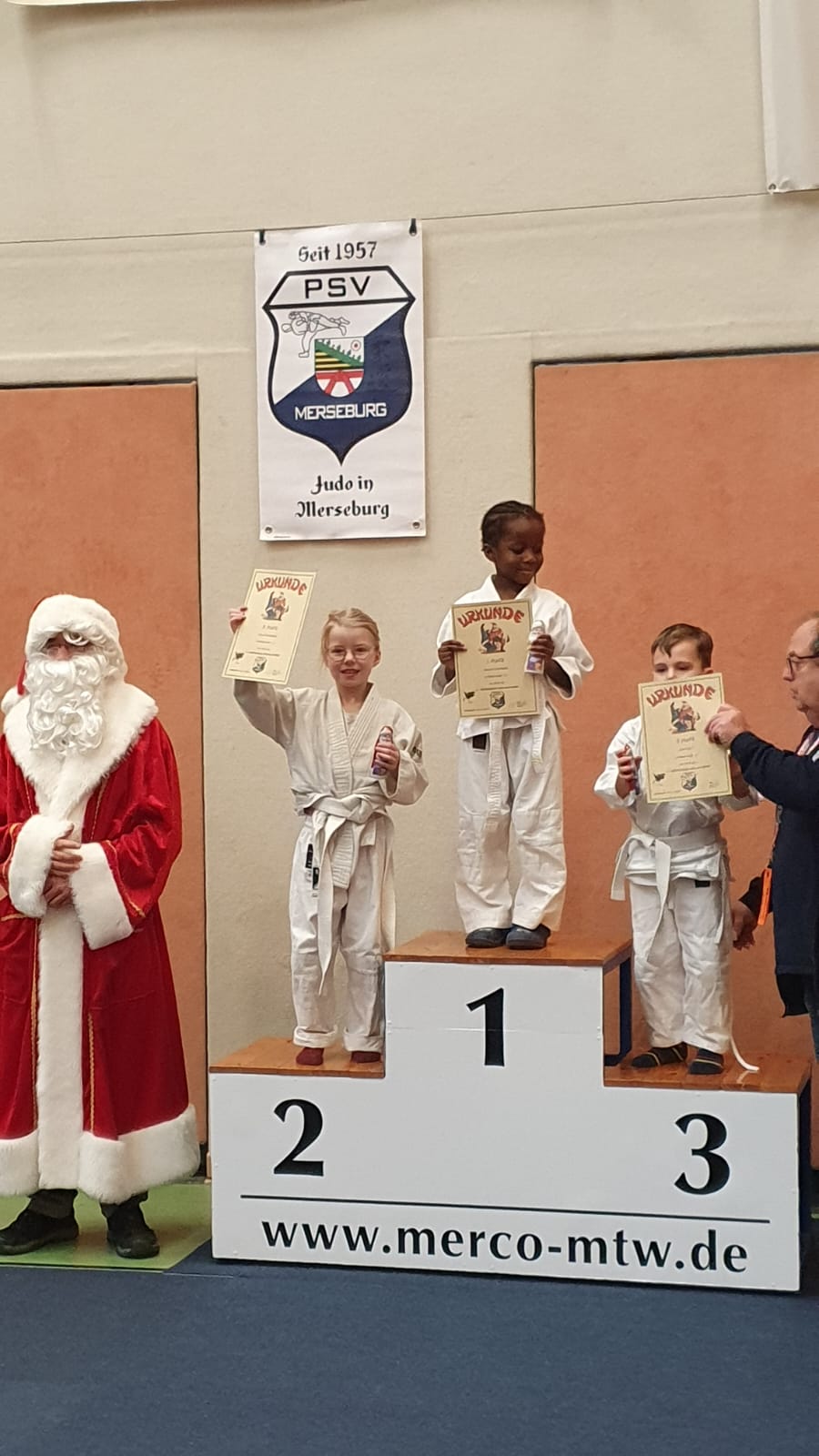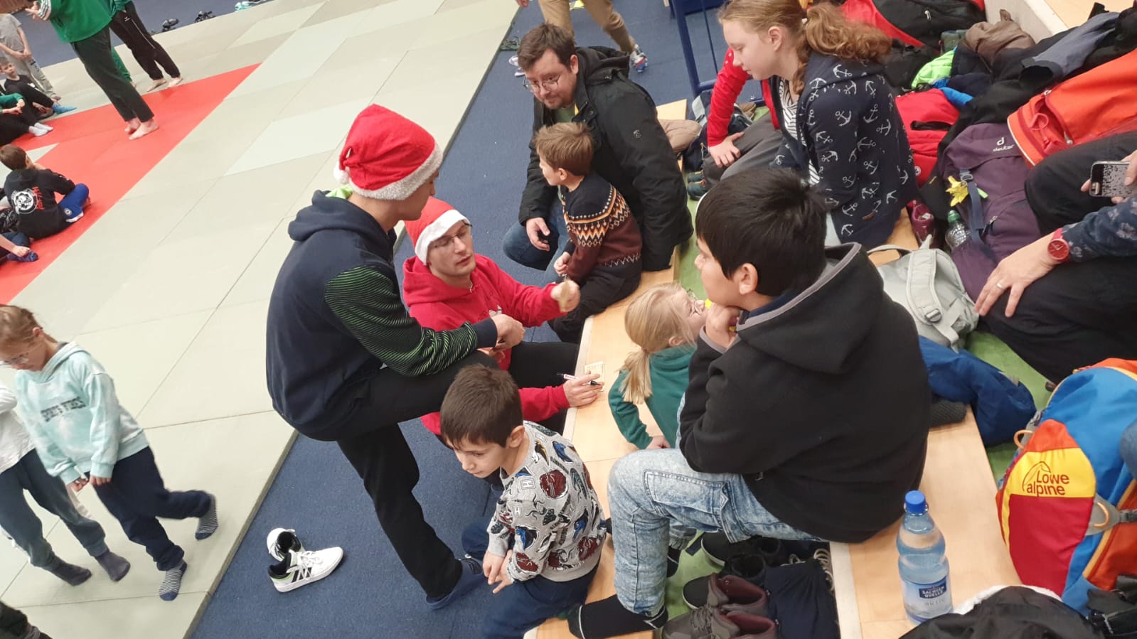 Zeitgleich kämpften die Kleinsten unseres Vereins beim Nikolausturnier in Merseburg unterstützt von Trainern Tom Luca und Jakob und Hilfstrainern Lucy, Jocelyn und Arthur (die alle drei auch selbst kämpfen konnten) und Tom. Außerdem war unser Christian Kaiser als Kampfrichterbeobachter vor Ort, Manuel unterstützte an den Tischen und Domfalke Dennis Dürgerov (Köthen) war ebenfalls als Kampfrichter auf der Matte im Einsatz. Für einige unserer Kleinen war es der allererste Wettkampf und begonnen wurde erst einmal mit Atmosphäre schnuppern, wiegen, spielen und Jakob und Tom Luca ärgern:
