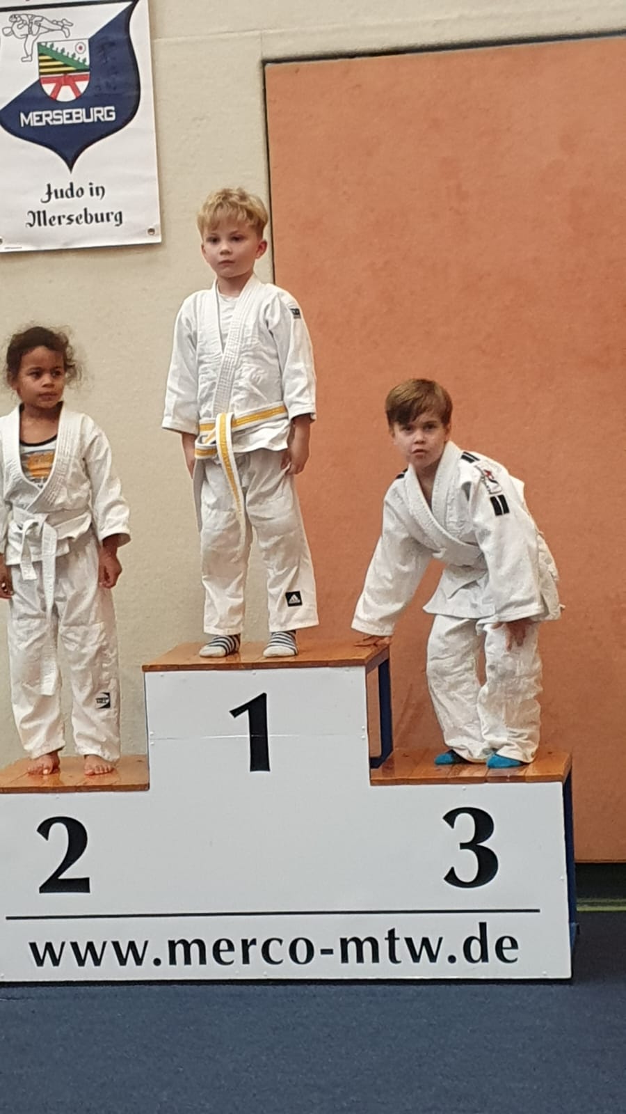 Nun musste Jakob sich als Listenführer an den Tisch setzen und so betreute maßgeblich Tom Luca die Großen. Lucy hatte nur eine Gegnerin, gegen die sie zweimal kämpfte (best-of-three). Sie unterlag zwar beide Male, beim zweiten Kampf hatte die deutlich erfahrenere Kämpferin aber hart an Lucy zu knabbern, was zeigt, dass Lucy manchmal einfach nur mehr an sich glauben muss. Der zweite Platz war definitiv erkämpft! Jocelyn hatte zwei Gegnerinnen, darunter eine Polin, die vor ein paar Wochen bei der polnischen Meisterschaft der U15 den 3. Platz geholt hatte. Hier war der Wettkampfpraxisunterschied einfach zu hoch aber Jocelyn kann mit dem dritten Platz zufrieden sein. Tom konnten von seinen vier kämpfen einen gewinnen und sich insgesamt gut verkaufen. Im Griff kontrollierte er seine Gegner meistens, nun muss er sich nur noch darauf konzentrieren, dies auch in Angriffe umzusetzen. Am Ende gab es den 5. Platz. Arthur ging nach fünf Kämpfen ebenfalls mit dem 5. Platz nach Hause aber auch er kämpfte sehr stark und konnte einmal gewinnen. Wieder einmal zeigte er seine starke Gegenseite. Nach über acht Stunden verließen auch die letzten unserer Crew die Halle in Merseburg.