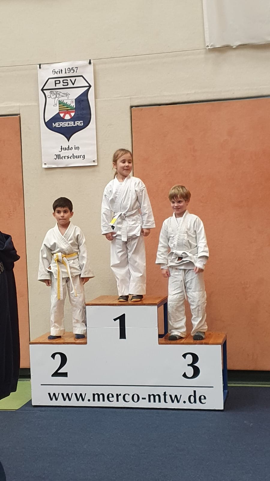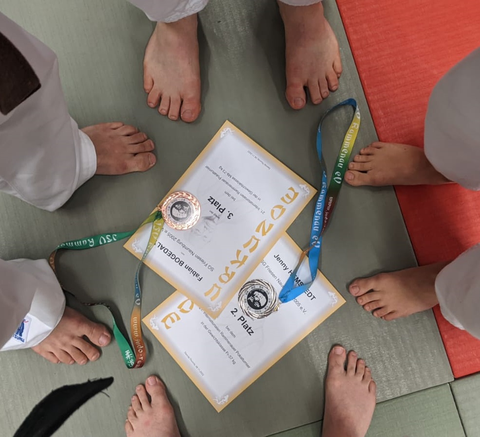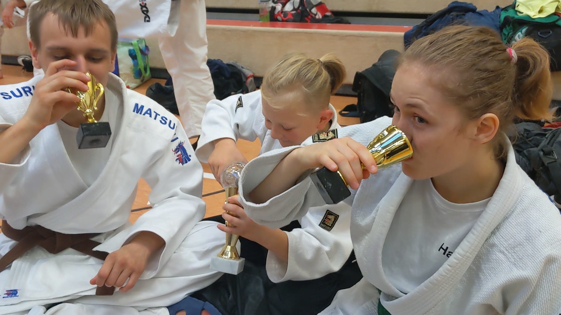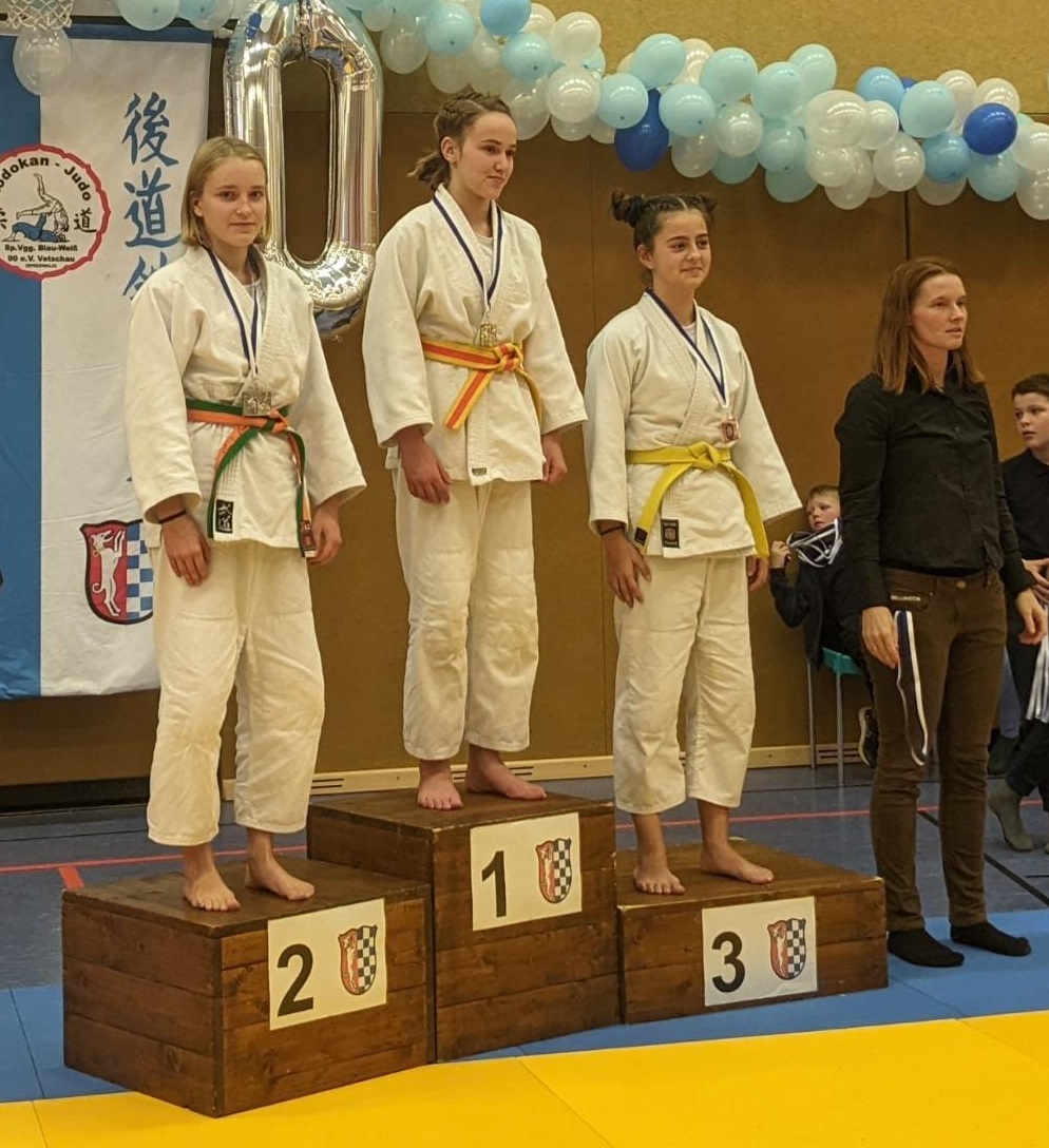 Nur sechs Tage später ging es dann am 12.11. nach Vetschau. Dieses mal hatten Amelie, Tom Luca und Jenny noch Tom Lucas kleine Schwester Lucy und Trainer Jakob als Verstärkung mit dabei. Lucy hatte an diesem Tag vier Kämpfe vor sich und konnte direkt ihren ersten nach vielen Angriffen im Hantei gewinnen. Im zweiten Kampf fiel sie unglücklich, merzte dieses Missgeschick aber direkt im nächsten Kampf mit einem Ippon für ihren Tai-otoshi aus. Der letzte Kampf ging leider wieder verloren, am Ende hatte Lucy aber mit zwei Siegen und zwei Niederlagen eine ausgeglichene Bilanz und freute sich über Bronze. Amelie startete im Vergleich zum letzten Wochenende eine Gewichtsklasse höher und konnte dort mit einem Seoi-nage wie er im Buche steht ihren ersten Kampf gewinnen. Im zweiten Kampf nutzte die Gegnerin Amelies Wurfvorbereitung geschickt aus, sodass Amelie geradewegs in den Wurf hineinlief und leider verlor. Dennoch konnte sich Amelie dieses mal über eine starke Silbermedaille freuen! Tom Luca standen wie seiner Schwester vier Kämpfe bevor, wobei er unter anderem auch auf seine zwei Gegner von letzter Woche traf. Zwar hielt er sich dieses mal besser, konnte sich jedoch nicht revanchieren und musste sich erneut beide male geschlagen geben. Im nächsten Kampf holte Tom Luca seine besten Techniken raus und konnte vorzeitig Ippon für seinen tiefen Seoi-nage erzielen. Ebenso schnell ging jedoch auch sein letzter Kampf gegen den späteren Sieger verloren. Abschließend mussten bei Tom Luca die Medaillen durch die Gleichverteilung von Siegpunkten dann auch noch ausgewogen werden, hierbei gehörte Tom Luca mit seinen 58 kg aber glücklicherweise nicht zu den schwersten und durfte sich genau wie seine Schwester über Bronze freuen. Jenny startete als letzte in ihre drei Kämpfe und konnte sich nach zwei Niederlagen aber auch einem gut herausgearbeitetemn Sieg ebenfalls Bronze um den Hals hängen lassen.