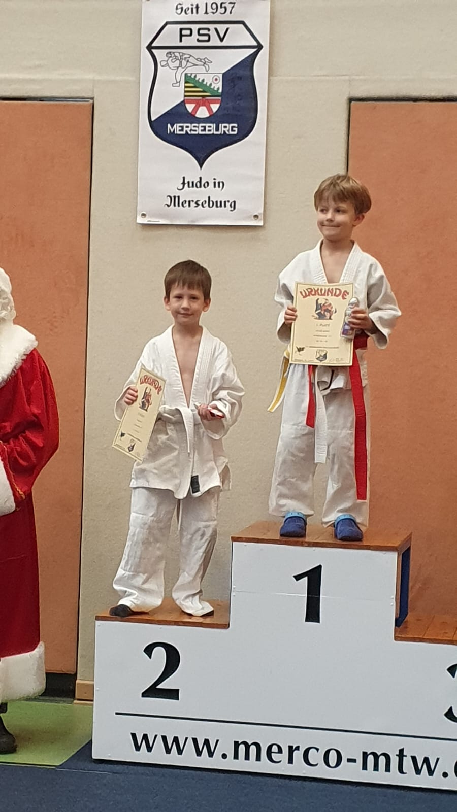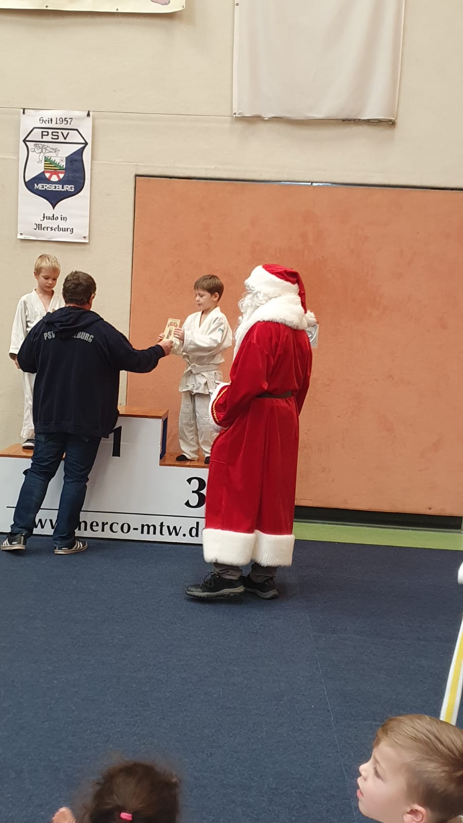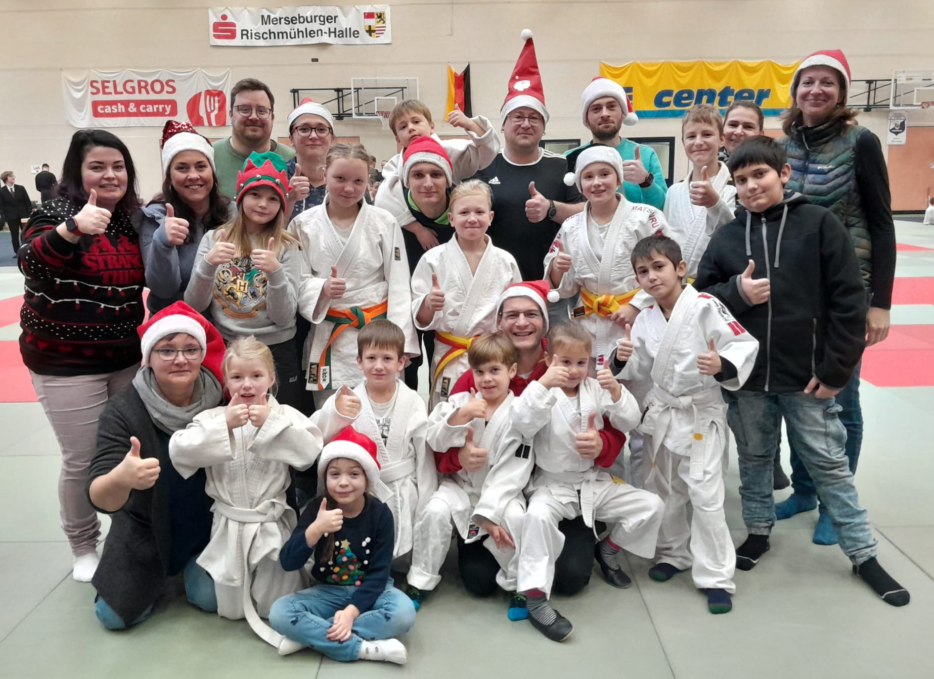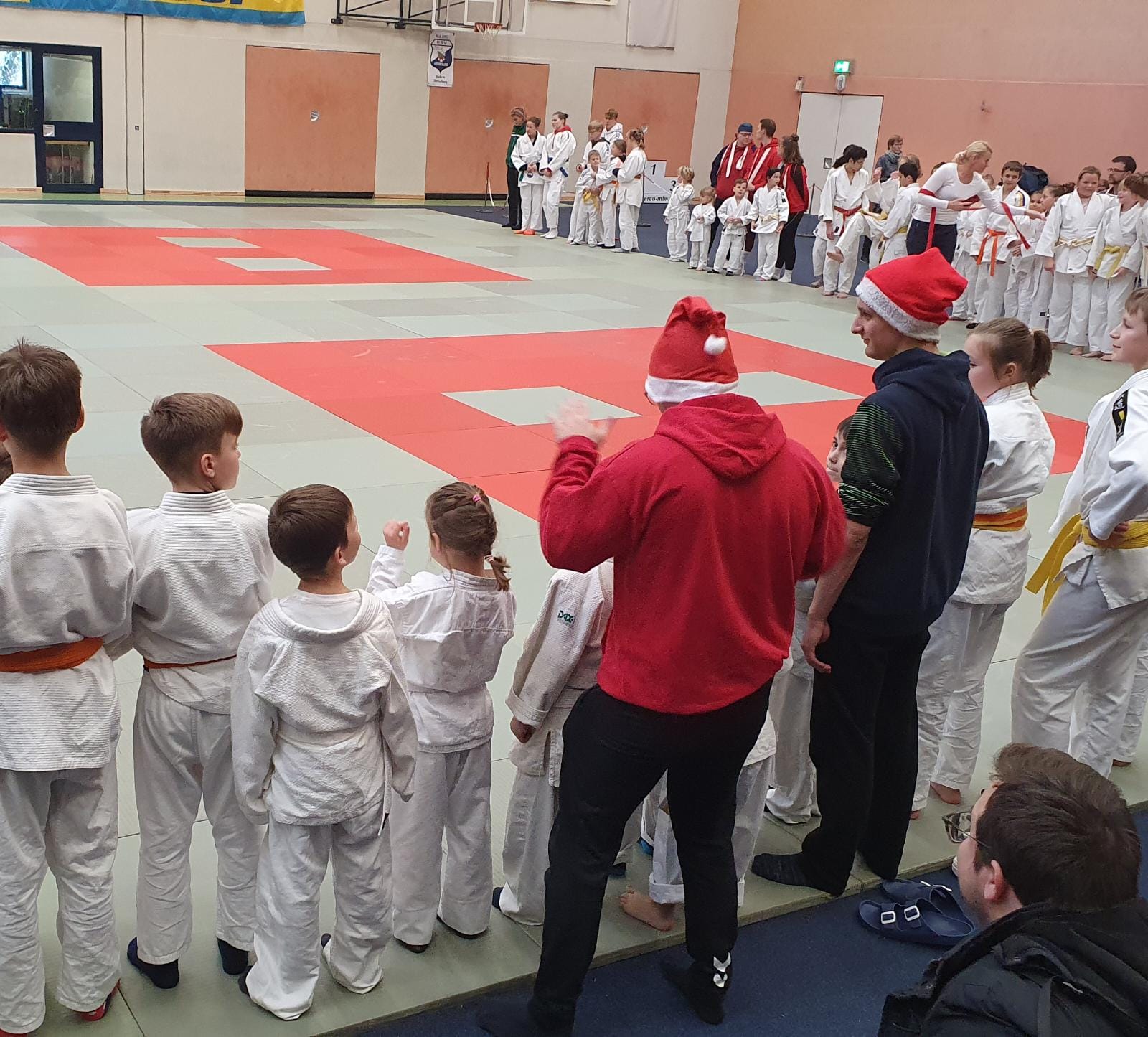 Dann hieß es aber auch Antreten und konzentrieren - dafür gingen Tom Luca und Jakob mit den "Minis" den Ablauf noch einmal durch und stellten sicher, dass jeder einen hübsch gebundenen Gürtel hatte. Insgesamt kämpften 324 Kinder und Jugendliche aus 34 Vereinen (darunter auch ein polnischer) in Merseburg um die Weihnachtsmänner aus Schokolade.