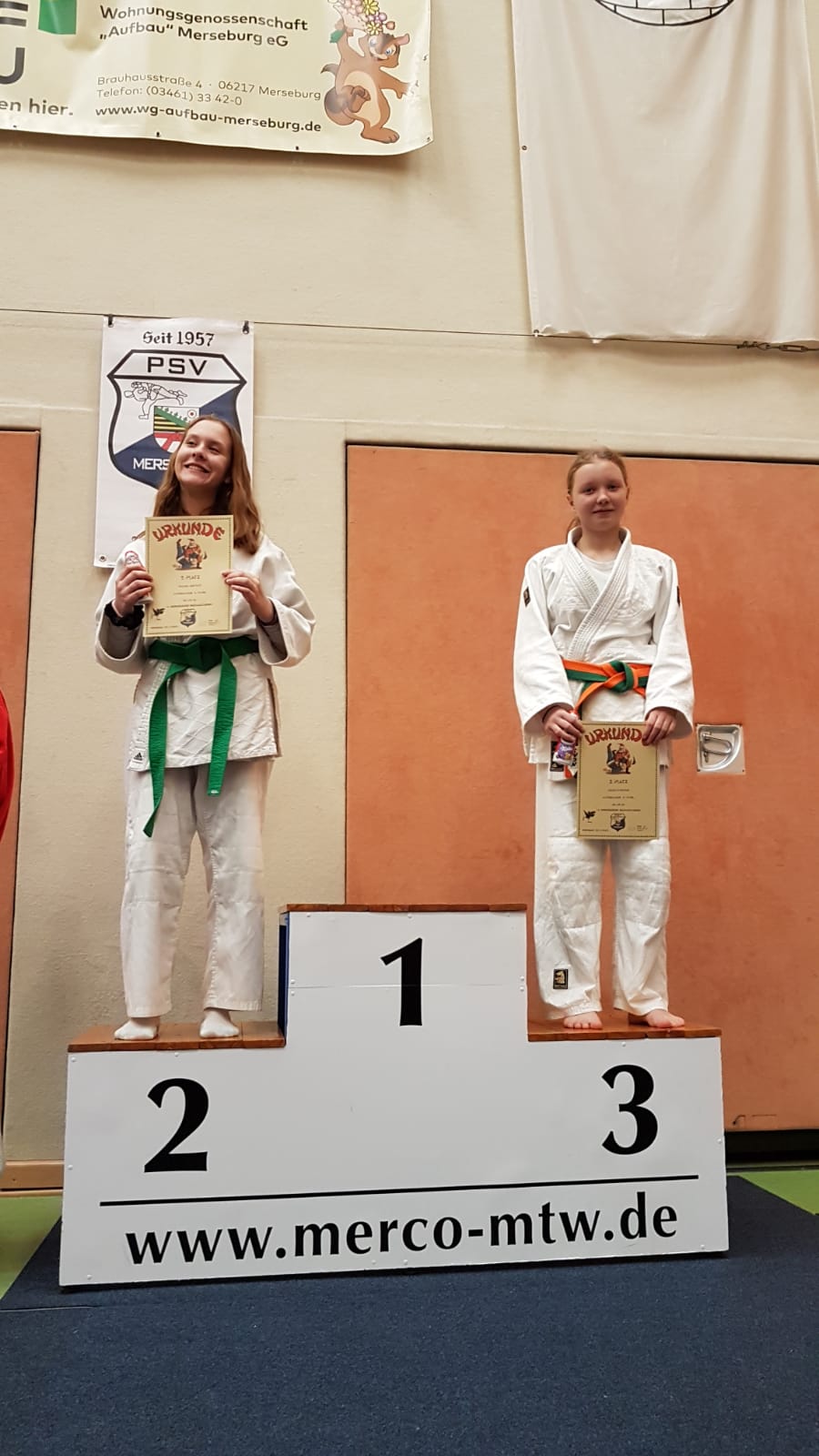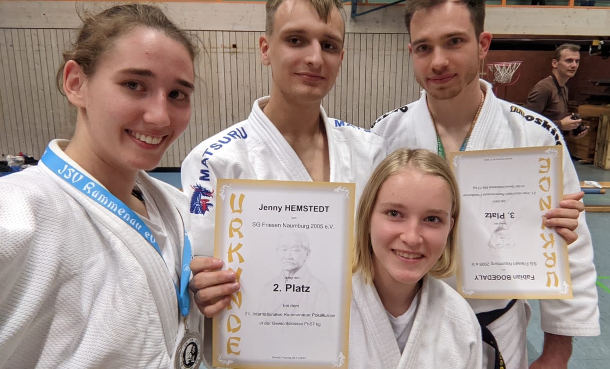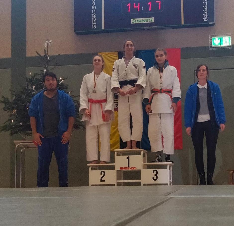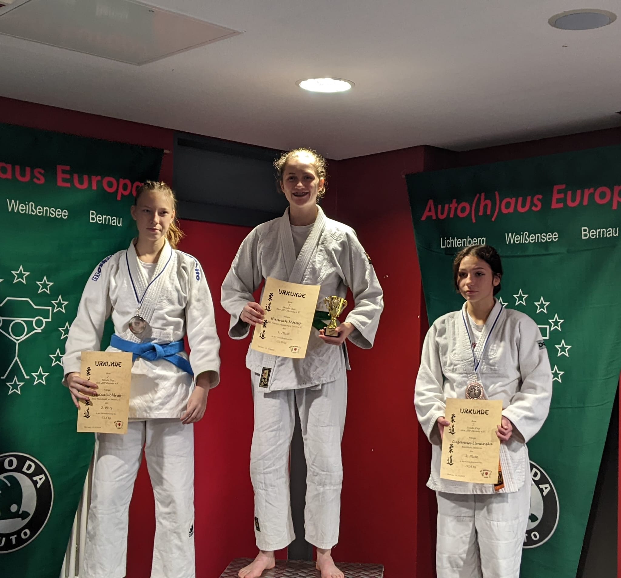 Tom Luca, Amelie und Jenny nutzen gleich zwei aufeinanderfolgende Wochenenden, um vor der Weihnachtspause nochmal Medaillen zu sammeln. Am 06.11. ging es dafür nach Rammenau gemeinsam mit Gast Fabian aus Jena. Ohne Waage wurden die Listen auf Vertrauensbasis erstellt und Amelie startete in der U15 -48 kg. In der vollsten Liste ihrer Altersklasse verlor sie beide Kämpfe knapp und schied damit leider vorzeitig auf Platz 7 aus. Nachdem der erste Kampf 4,5 Minuten dauerte, war in diesem am Ende die Luft raus und Amelie stolperte in einen Waza-ari der Gegnerin. Im nächsten Kampf forderte diese Anstrengung ihren Tribut und Amelies Angriffe wurden ausgekontert. Dennoch macht sich das kontinuierliche Training so langsam bemerkbar und wird sich mit Sicherheit bald auszahlen. Auch Tom Luca schied an diesem Wochenende leider nach zwei Niederlagen vorzeitig aus. Er schaffte es dieses mal leider nicht, die körperliche und technische Überlegenheit der Gegner zu überwinden, wobei erwähnt werden sollte, dass Tom Luca auch in der Kategorie „Männer“ startete und nicht in seiner eigentlichen Altersklasse der U21. Jenny und Gaststarter Fabian begannen das Turnier in ihren Gewichtsklassen ebenfalls jeweils mit einer Auftaktniederlage, konnten ihre anschließenden Kämpfe jedoch alle Gewinnen und kämpften sich somit auf das Podest. Am Ende gab es Bronze für Fabian und Silber für Jenny.
