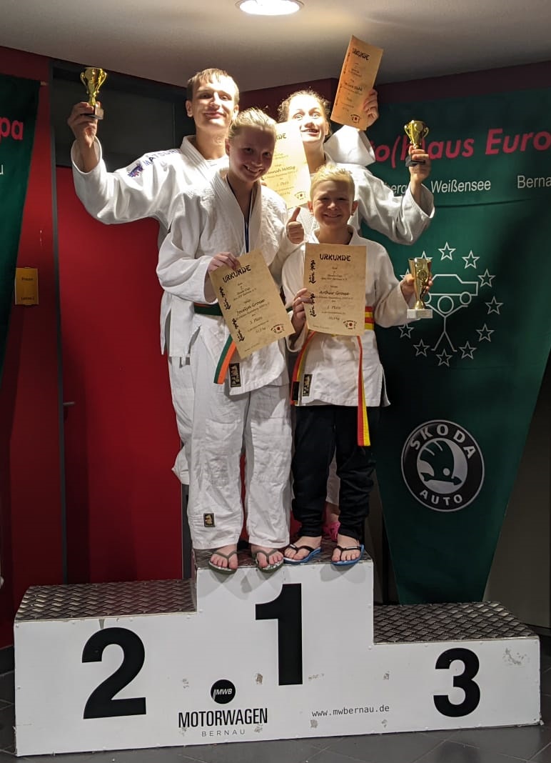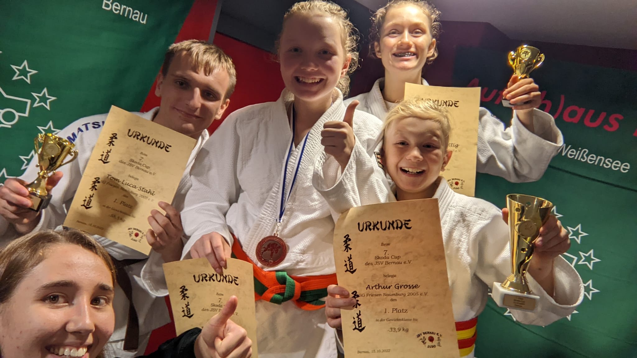 Vergangenen Samstag machte sich wieder eine kleine Gruppe aus Naumburg, bestehend aus Arthur und Jocelyn Grosse, Hannah Möttig und Tom Luca Stahl gemeinsam mit Jenny Hemstedt auf den Weg nach Bernau zum Skoda-Cup. Wegen der Vielzahl an Teilnehmern von über 500 Kämpfern entschieden sich die Veranstalter für Gewichtsnahe Gruppen, um überfüllte Listen zu vermeiden.