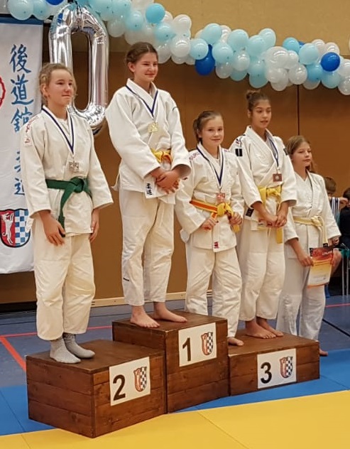 Jocelyn hatte die längste Wartezeit und gleichzeitig auch das größte Pech bei der Einteilung der Gruppen. Während Arthur, Tom Luca und Hannah jeweils zu den schwersten ihrer Gruppe zählten, war Jocelyn mit 4 kg Abstand die leichteste in ihrem Pool. Auch hier gingen die Kämpfe zwar schnell vorbei jedoch leider stets mit einer Niederlage. Die Kämpfe dauerten zwar von Runde zu Runde immer etwas länger und Jocelyn versuchte die Traineranweisungen umzusetzen, jedoch durchkreuzten die erfahreneren Sportlerinnen ihr immer wieder die Pläne. Der Mut und Ehrgeiz sowie auch die Geduld wurden am Ende aber mit der Bronze-Medaille honoriert (auch wenn die eingeschobene Siegerehrung leider verpasst wurde).