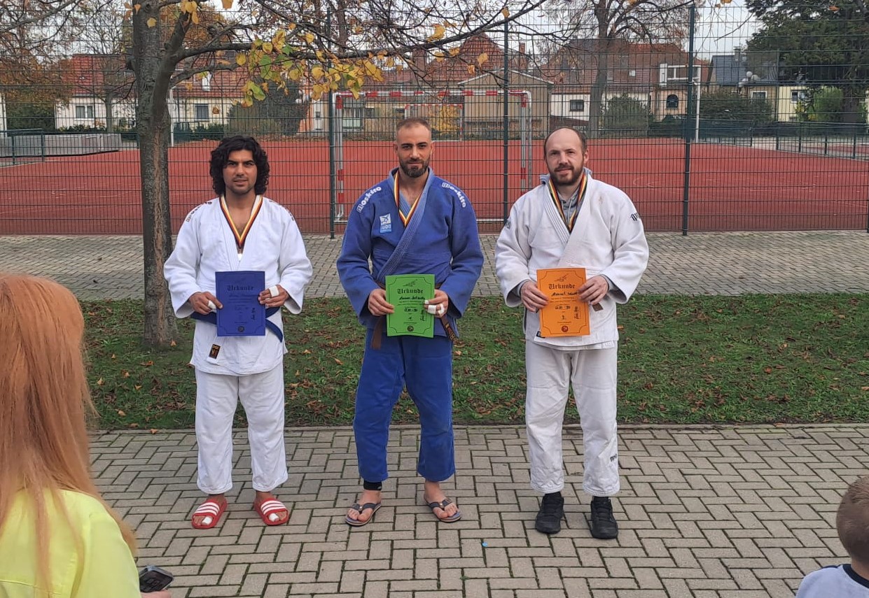 Frank wollte sich eigentlich seinem ersten Wettkampf stellen, aber der Rücken machte da nicht mit. Es juckte ihn zwar deutlich, als er die anderen beim Training sah, aber Vernunft und Ehefrau hielten ihn (richtigerweise) im Zaum. Dafür sorgte er als Grillmeister mit seiner Frau Siggi dafür, dass am Ende niemand hungrig oder durstig losfahren musste. Unser Dauer-Gast-Domfalke Vasile erkämpfte sich mit fünf dominanten Siegen in seiner Gewichtsklasse außerdem Gold und Vereinsfreund Lars aus Quedlinburg Silber hinter ihm. Das Comeback des Jahres feierte Manuels Frau Lisa, die sich spontan dazu entschloss endlich mal wieder einen Judoanzug anzuziehen. Nach drei vorzeitigen Siegen hatte sie gezeigt, dass sie es noch drauf hat. Gold für Lisa! Tom Luca und Jakob besetzten den ganzen Nachmittag Tisch und Listen. Am Ende ging wieder ein schöner Tag in der Judohalle rum und unser Verein präsentierte sich wieder einmal als erfolgreicher Ausrichter. Unser inzwischen gut eingespieltes (aber leider sehr kleines) Ausrichter-Team erhielt fast ausschließlich positives Feedback und hatten zwischendurch sogar Spaß an der ganzen Sache