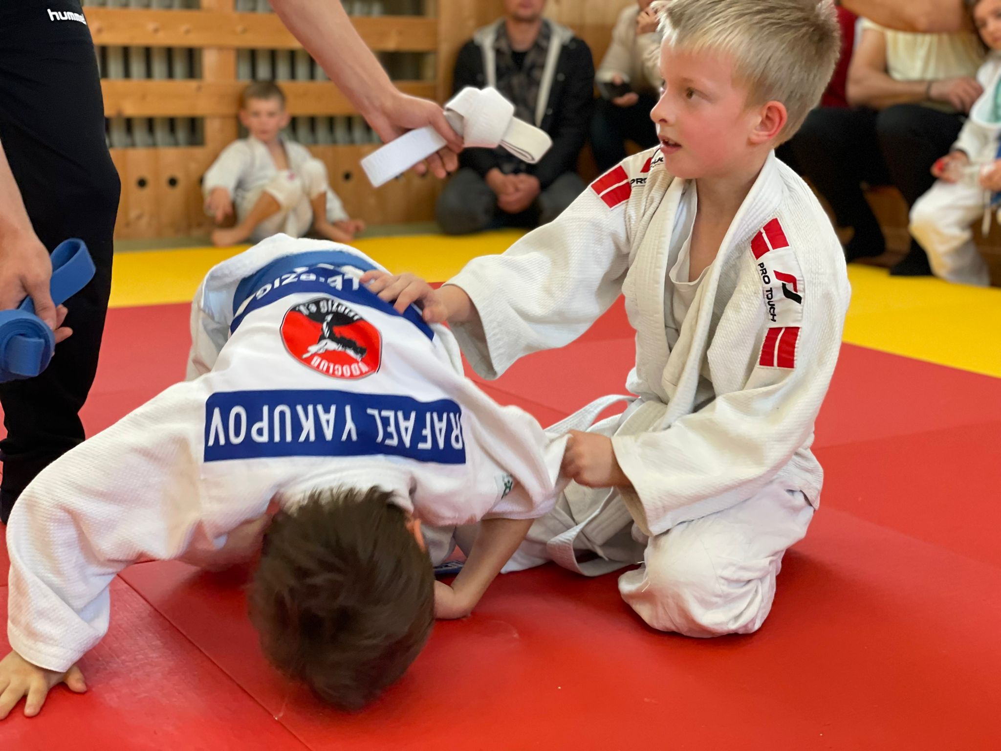 Dann ging es für unsere Minis auch schon direkt los. Alle kämpften sehr beherzt und gaben sich große Mühe; über Siege wurde sich gefreut, über Niederlagen ein bisschen geärgert aber immer standen alle wieder auf, gaben alles und reichten am Ende den Gegnern die Hände. Alle bemühten sich mit "T-Rex-Superman" die anderen hinzuschmeißen und mal klappte das besser, mal schlechter. Am Ende konnten sich Roman, Scott und Masser über den 3. Platz freuen.