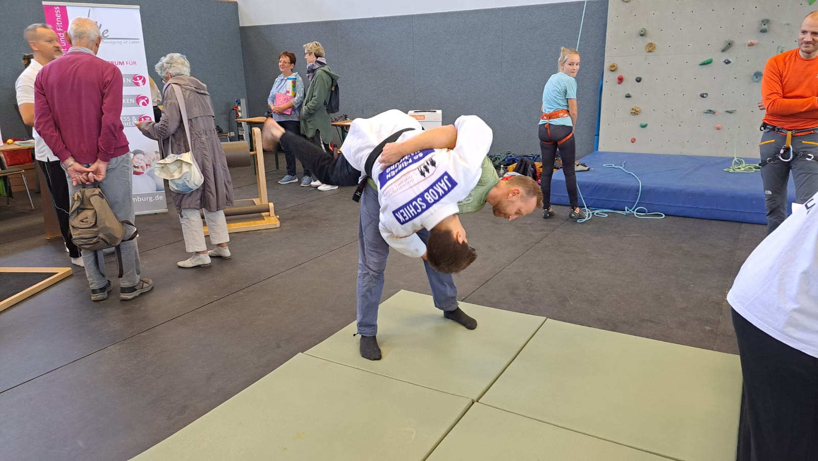 Am vergangenen Samstag nutzen unsere Judoka die Messe "aktiv Burgenlandkreis" um sich vor potentiellen Mitgliedern und Partnern zu präsentieren. Zwischen Klettern, Kunstturnen, Reha-Sport, Sparkasse und Naumburger Tageblatt fanden sich Jakob und Jenny mit vier Matten, vielen Buttons, einem Pokal und T-shirts im Euroville ein.