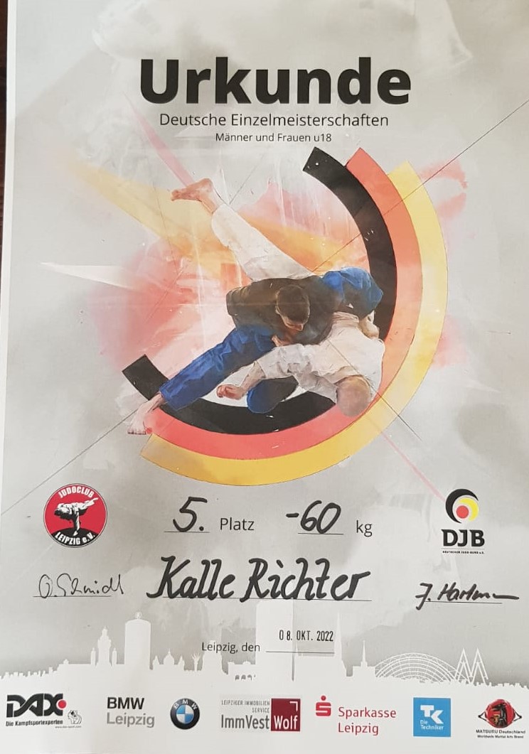 Mit sehr sehr gutem Judo sicherte er sich aber die Platzierung bei der Deutschen Meisterschaft 2022 und Stützpunkttrainer Stephan Fröhlich konstatierte, dass das Ergebnis medaillenwürdig war und das Ergebnis nicht die Kampfleistung Kalles widerspiegelte.