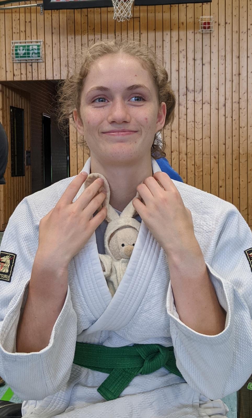 Hannah startete als erste in den Wettkampf und konnte zweimal sehr überlegen und technisch sauber gegen die Braun-Gurt-Gegnerinnen gewinnen und sich über Gold freuen - Teddy freute sich auch: