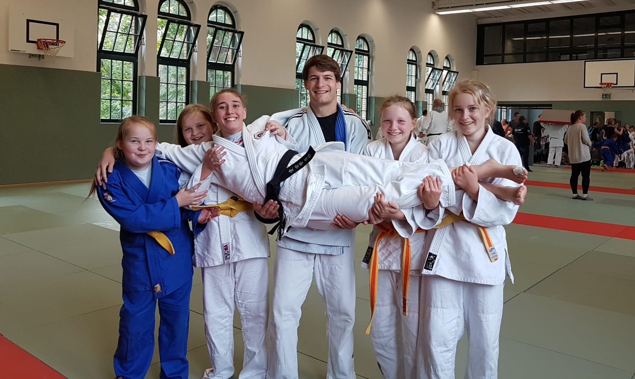 Nach einer intensiven Erwärmung ging es in eine kurze Technikeinheit, bei der die Sportler der U12 die große Außensichel O-soto-gari übten und für die größeren Morote-seoi-nage zu beiden Seiten mit anschließendem Hebel auf dem Plan stand. Danach ging es dann in bis zu zehn Runden Standrandori für Groß und Klein im Wechsel. Diese Möglichkeit, sich mal wieder gegen andere Sportler auszuprobieren, wurde von allen intensiv genutzt und man konnte viele schöne Aktionen beobachten! Leider musste Jocelyn nach der siebten Runde mit einem blauen Knöchel aussetzen und konnte somit das Spektakel nur noch von außen betrachten.